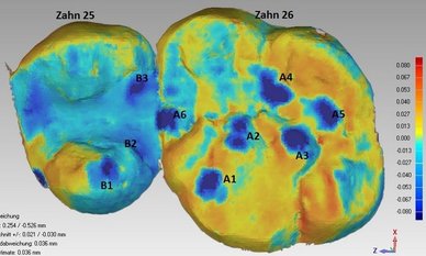 Prof. Dr. Sven Reich zeigte in seiner 2016 prämierten Arbeit, dass - bezogen auf den von Einzelkronen verursachten Verschleiß - die vertikale Verlustrate nach den ersten 12 Monaten abnahm. Hier: Überlagerung von zwei intraoralen digitalen Abformungen, die zu unterschiedlichen Zeitpunkten erfasst wurden. Die morphologischen Unterschiede auf den Kauflächen sind farbkodiert. Die dunkelblauen Areale zeigen die Bereiche mit einem erhöhten vertikalen Substanzverlust.