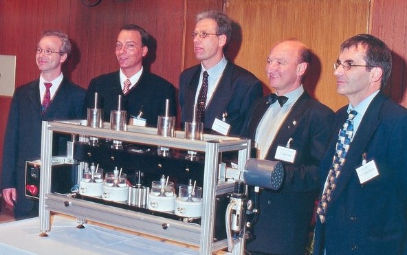 Abbildung: Ihr erstes Symposium veranstaltete die junge Arbeitsgemeinschaft für Keramik in der Zahnheilkunde e.V. im Jahr 2001 an der Universität Köln. Hier (v.l.n.r.) Prof. Dr. Karl-Heinz Kunzelmann, Prof. Dr. Roland Frankenberger, Prof. Dr. Peter Pospiech, Dr. Bernd Reiss, Prof. Dr. Lothar Pröbster vor einem "Kausimulator mit Thermocycling" zur in vitro Testung von Keramikrestaurationen der ehemaligen Willytec GmbH. (Bild AG Keramik)