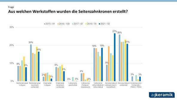 Die Praxisbefragung der AG Keramik ist eine in ihrer Art einzigartige quantitative Studie, die einen direkten Einblick in die tatsächliche Praxis der Versorgung mit indirekten Restaurationen erlaubt. Trends bei der Wahl der Werkstoffe und Verfahren lassen sich so frühzeitig erkennen. Seit Beginn der Erhebungen 2015 konnten bereits über 11.000 Restaurationen ausgewertet werden. Die aktuelle Auswertung des Erfassungszeitraums 2021 liegt nun vor.